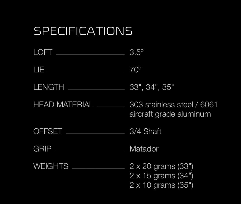 Crafted from 303 stainless steel with a 6061 aircraft grade aluminum sole component, the compact Phantom Black 5.5 mid-mallet maintains its blade-like feel and includes a tour-proven, urethane-coated custom Matador grip.